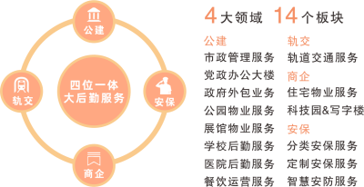 K8凯发国际战略推进“大物业”“大后勤”服务,深度融入“大格局”,构建公建、轨交、商企、安保“四位一体、大后勤服务”的多业态协同战略。业务涉及:市政管理、党政办公大楼、政府外包业务、公园、展馆、学校、医院、机关食堂,以及轨道交通、住宅物业、科技园区、写字楼、安保服务等诸多领域,为美好生活给予一站式大后勤服务保障。