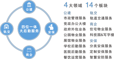 在开展战略上,K8凯发国际坚持多渠道、多业态布局,推进“大物业”城市后勤服务,深度融入“大格局”,构建了公建、轨交、商企、安保“四位一体、大后勤服务”的多业态协同战略。业务涉及:市政管理、党政办公大楼、政府外包业务、公园、展馆、学校、医院、机关食堂,以及轨道交通、住宅物业、科技园区、办公写字楼、安保服务等诸多领域,为智慧城市给予一站式服务保障。正是得益于在多元化新业态探索、智慧服务创新等方面实现的重大突破,K8凯发国际在竞争越发激烈的市场环境下,长期保持了业绩稳定向好。
