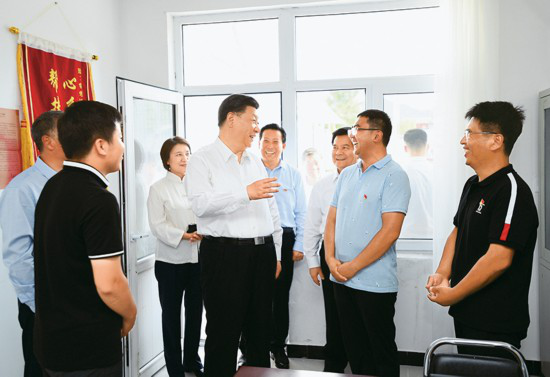 2019年7月15日至16日,中共中央总书记、国家主席、中央军委主席习近平在内蒙古考察并指导召开“不忘初心、牢记使命”主题教育。这是15日下午,习近平在赤峰市喀喇沁旗河南街道马鞍山村党群服务中心分析基层党建、民族团结和乡村振兴情况。 新华社记者 谢环驰/摄