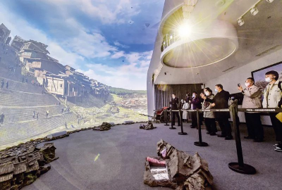 近年来,重庆红岩革命纪念馆以新技术把革命文物搬上屏幕和舞台,创新革命文物展示,让红岩革命文物“活”起来。图为在重庆红岩革命纪念馆“红岩记忆”数字体验厅内,观众们观看以双曲三维穹幕技术展示的场景。新华社记者 李贺/摄